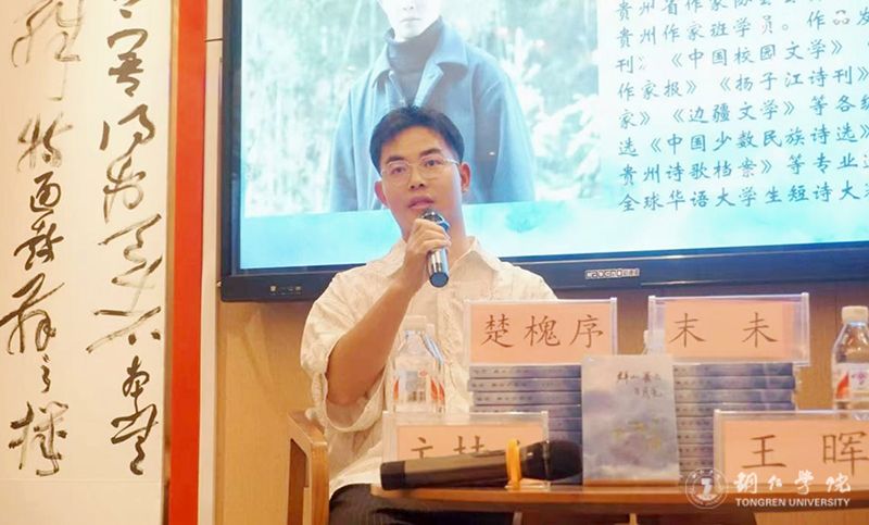分享会上,楚槐序对学校和各位老师为诗集出版给予鼓励与提供帮助表示感谢。他介绍,该诗集以黔地风光、民俗人文为书写核心,兼有一部分山水与日常所感的诗作,集中表达了自己对故土风物的深情回望。书名经过反复推敲,在与责编老师沟通打磨的过程中,收获颇丰。他还讲述了个人写作历程及笔名由来,表示正是在写作之路上的坚持,他才得以不断成长,而今后的路还很长,他将继续坚持,争取写出更多更好的诗作。
