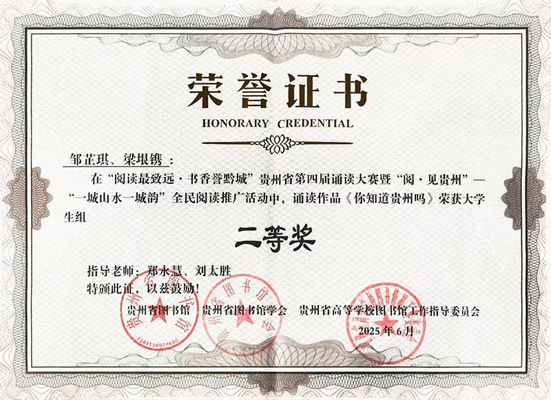 在贵州省图书馆主办的“阅读最致远·书香誉黔城”第四届诵读大赛暨“阅·见贵州”全民阅读推广活动中,2022级汉语言文学二班邹芷琪同学以声传情、以诵达意,凭借对《你知道贵州吗》一文的精彩演绎,摘得省级二等奖。她以富有感染力的语言艺术,将贵州故事娓娓道来,既展现了深厚的语言表达功底,更传递了对本土文化的深刻理解与热爱。