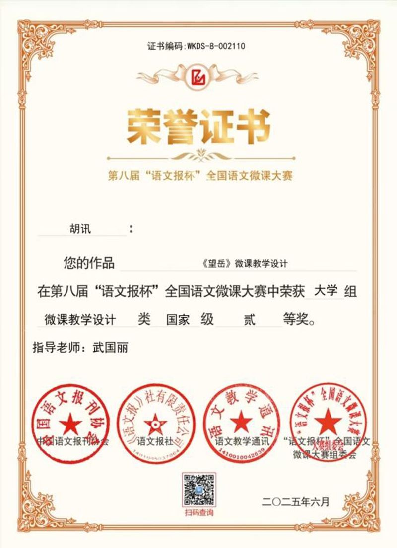 在第八届“语文报杯”全国语文微课大赛中,2022级汉语言文学一班胡迅同学凭借《望岳》微课教学设计脱颖而出,荣获大学组微课教学设计类国家级二等奖。该赛事作为全国语文教育领域的权威平台,吸引了全国高校学子同台竞技。胡迅同学的作品以“诗画融合”为设计理念,通过情境化诵读、意象分析与跨时代联结,生动诠释了杜甫诗作的精神内涵,其创新的教学思路与扎实的文本解读能力获评委高度认可。