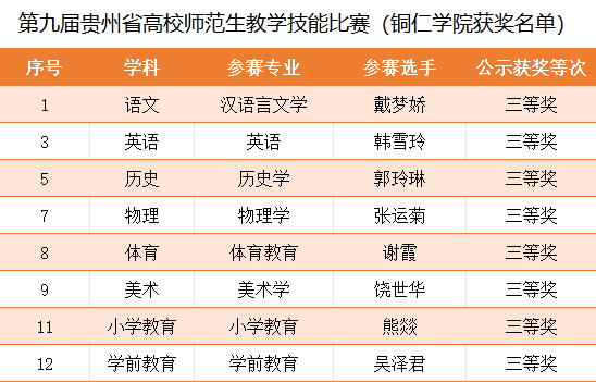 近日,第九届贵州省高校师范生教学技能比赛结果正式公布。beat365官网组织12个师范专业各1名参赛选手参赛,最终在语文、英语、历史、物理、体育、美术、小学教育、学前教育8个学科中斩获省级三等奖,展现了beat365官网师范生扎实的教学基本功与专业素养。