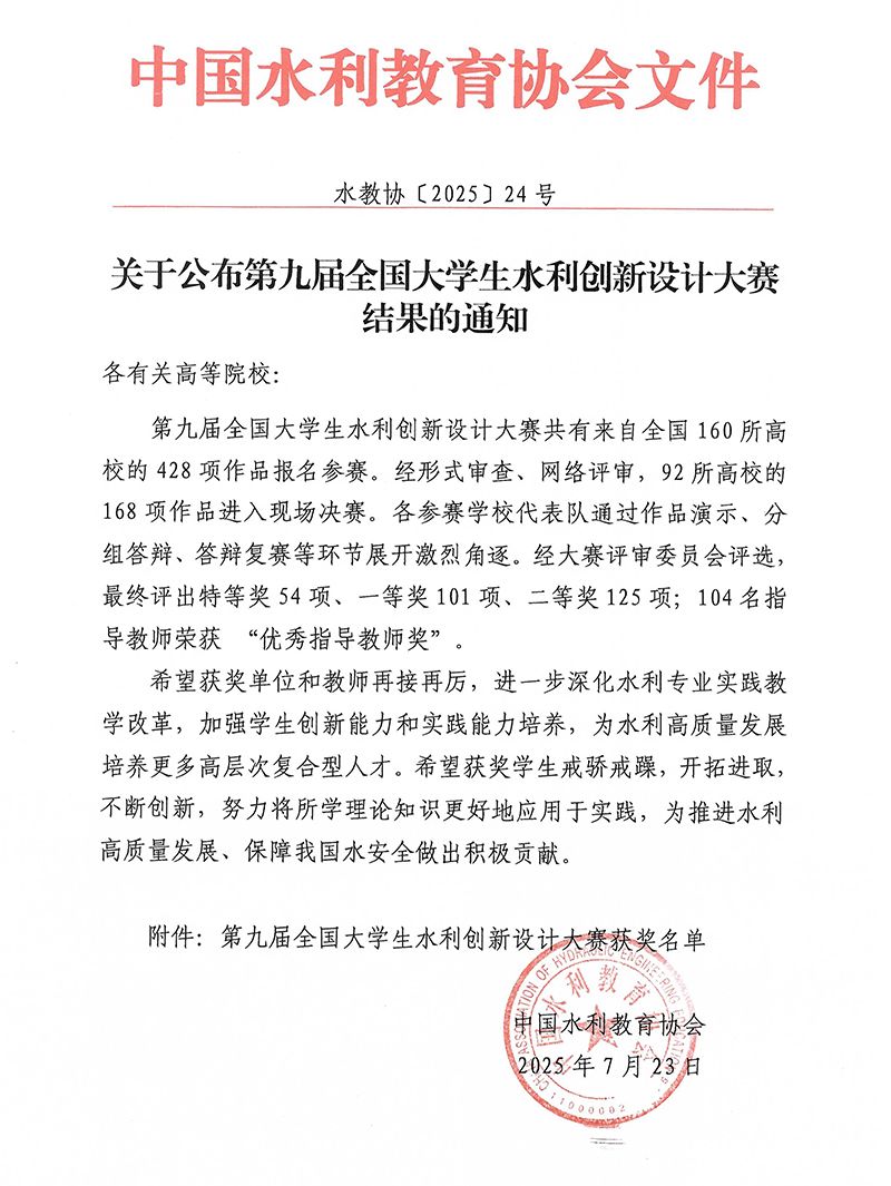 全国大学生水利创新设计大赛于2023年入选教育部全国普通高校学科竞赛排行榜,是全国水利类大学生的“奥林匹克”竞赛,每两年举办一届。大赛旨在激励广大水利类专业本科学生踊跃参加创新实践训练,培养学生的协作精神、创新意识和实践能力,为我国水利事业建设和发展培养一批创新型人才,促进水利高等教育人才培养质量的不断提升。