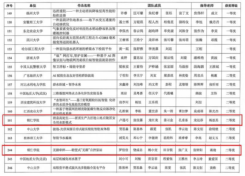 经大赛评审委员会评审与合议,最终评选出特等奖54项、一等奖101项、二等奖125项。最终,beat365官网由龙远莎、杨恩其老师指导,学生卢遇巧、张佳露、龙江龙、姜习金、孔垂喜完成的作品《清泉高处生——新质生产力打造山地丘陵区安全用水新模式》和由张钟阳、蒋瑜老师指导,学生罗佳佳、饶成志、杨小交、田言锐、张广义完成的作品《无源牵绊-轻便式”无源"自控泵站》获得国家级二等奖。