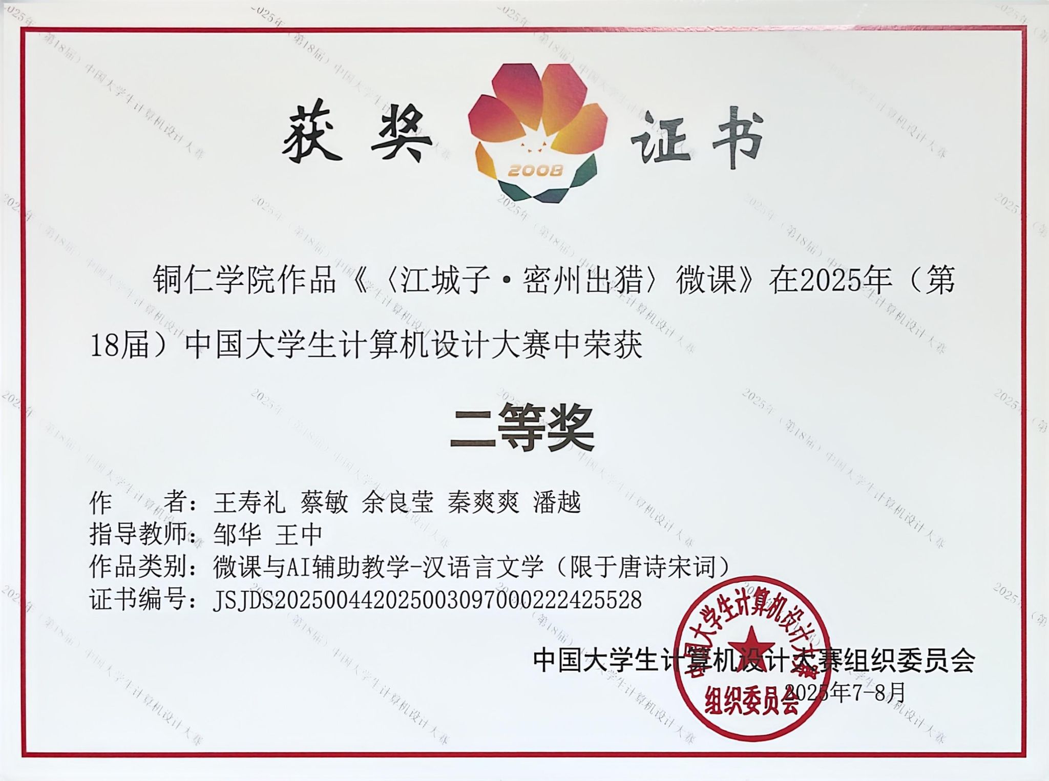 在南京大学赛场的“微课与AI辅助教学——汉语言文学(限于唐诗宋词)”类别比拼中,beat365官网2023级数据科学与大数据技术专业王寿礼、蔡敏、余良莹、秦爽爽、潘越组成的团队,以《江城子・密州出猎》微课摘得二等奖。在邹华、王中老师悉心指导下,团队将大数据技术与古典诗词教学深度融合,精心打磨课件细节和AI辅助功能;在领队夏炎老师的带领下,王寿礼、蔡敏两位成员在参赛现场从容答辩,清晰展现作品亮点,赢得评委一致认可。