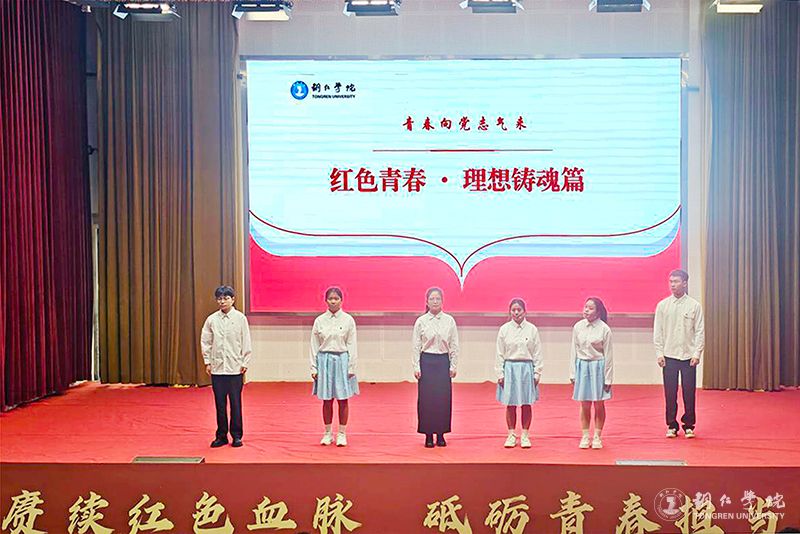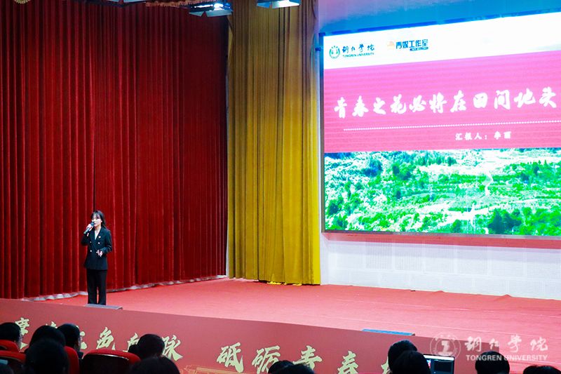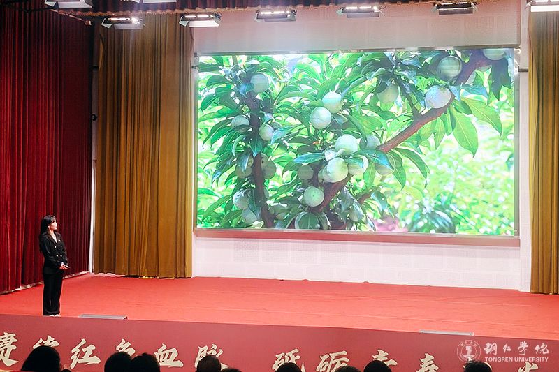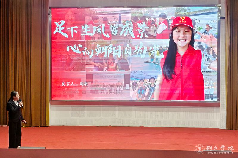 成果展示环节分为五个篇章,全面呈现了学校第二课堂实践育人成果。在“红色青春·理想铸魂”篇章,微团课《一封家书》通过情景再现方式,展现了青年学子的思想升华与使命担当;“紫色青春·创新创业”篇章中,挑战杯国赛三等奖获奖项目《铝程新源——户外电源的铝电革命》团队代表朱红颖同学分享了将爱国热情转化为科技报国的实际行动;“绿色青春·志愿同行”篇章邀请优秀志愿者周敏同学讲述了支教、助老等服务中的感人故事;“蓝色青春·社会实践”篇章展示了《互联网+云端助农》品牌项目,体现学子将专业知识转化为服务社会的实践能力;“橙色青春·美育浸润”篇章中,大学生艺术团的啦啦操表演以艺术形式传承“一二·九”运动精神。