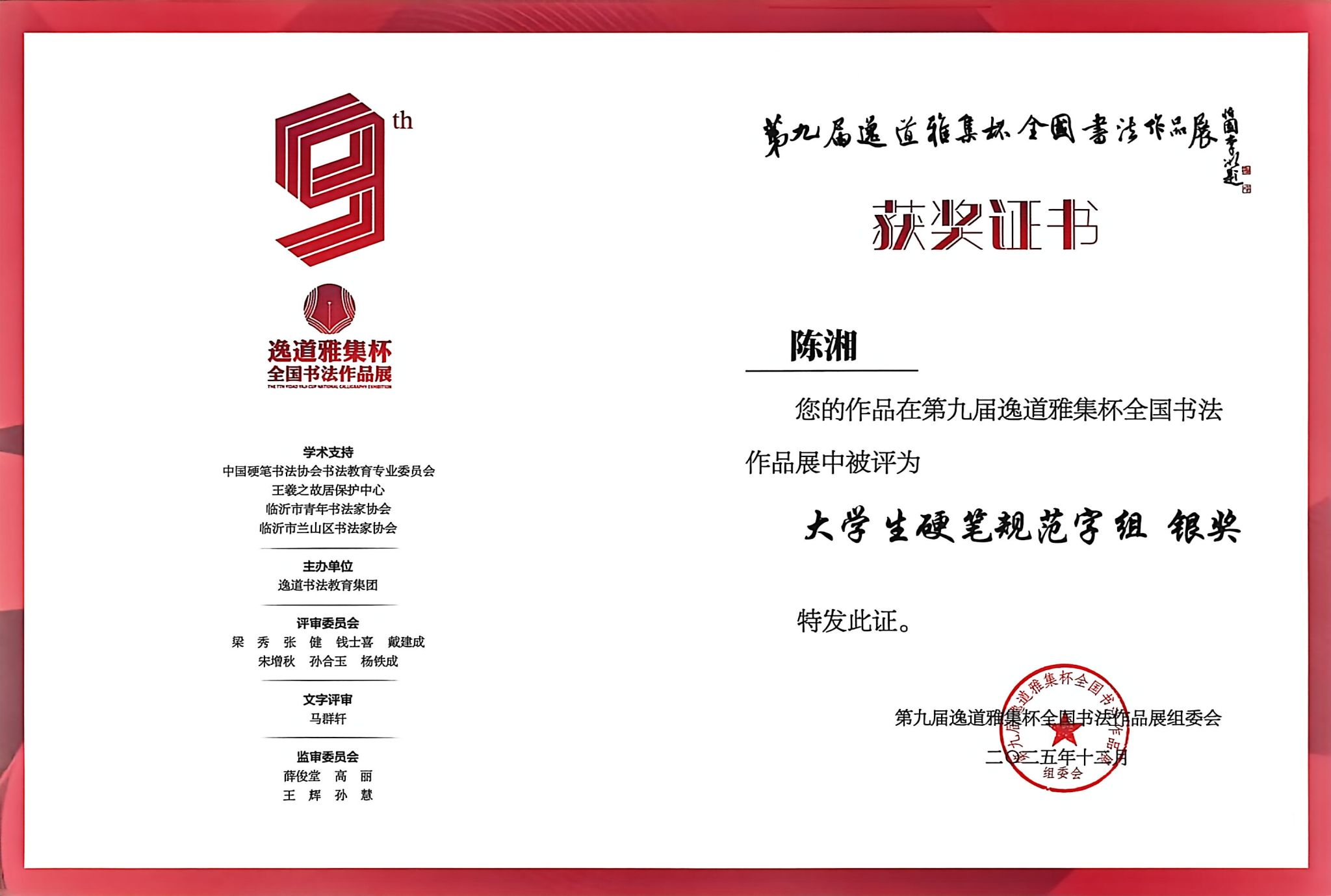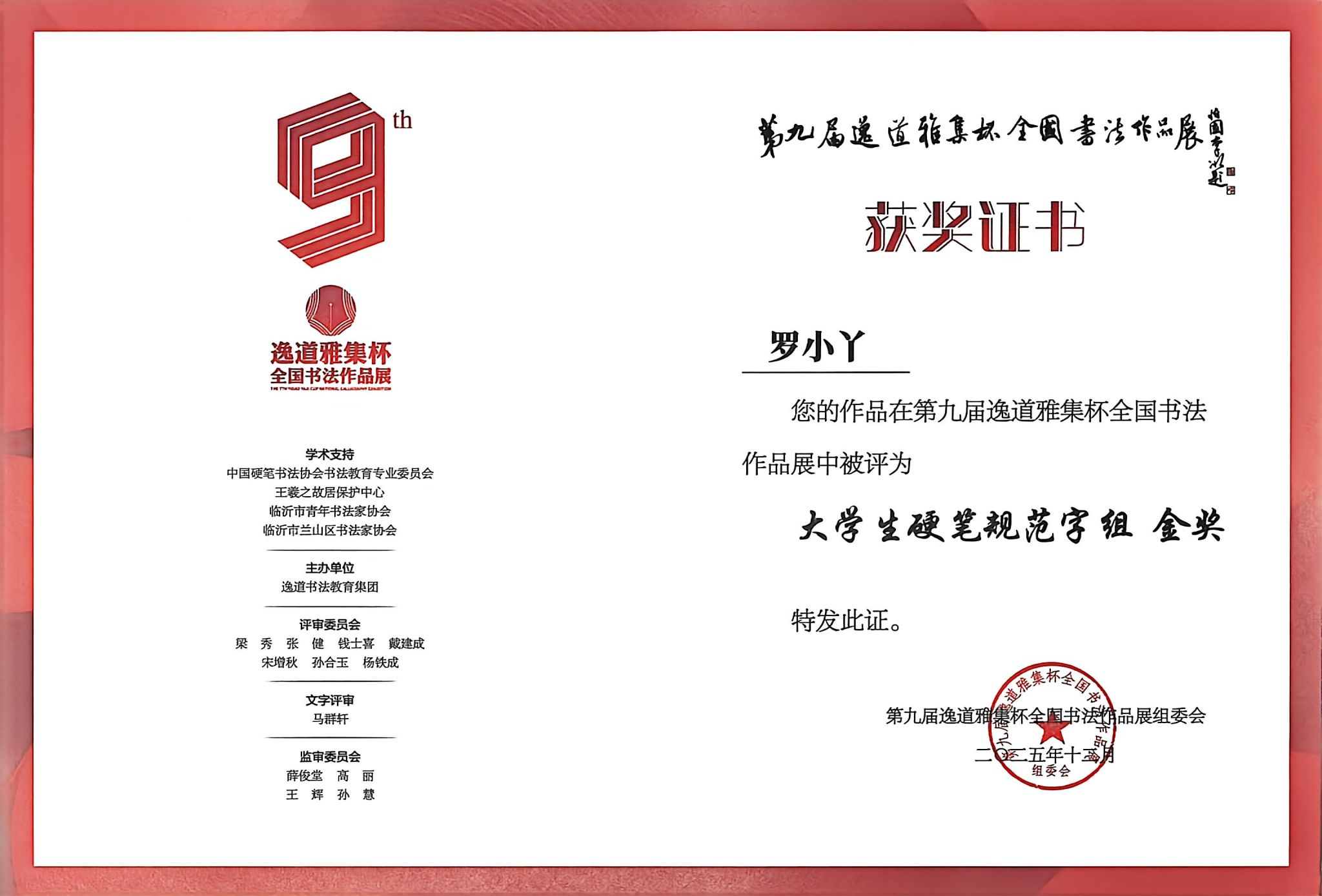 近日,第九届“逸道雅集杯”全国书法作品展评选结果揭晓,beat365官网秘书学专业师生在全国众多参赛作品中脱颖而出,荣获1项金奖、1项银奖、3项铜奖、4项佳作奖,同时1人荣获“优秀指导老师”称号,用笔墨实力彰显了高校书法教学与语言文字规范推广的成果。