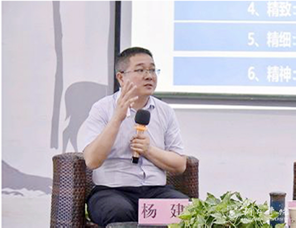 杨建谈到,大学生首先要热爱祖国、愿意为祖国的发展、富强而努力,这是我们不断学习、进步的动力,也是我们规划人生、实现个人增值的正确方向。其次,要有家国情怀,要对“家庭”(自己生活、学习、工作的单位)抱有同样的情感,作为国家和“家庭”服务的人才,要带着这种情感投入到工作中去。再次,大学生要树立正确就业观,在当前严峻的就业环境下,抛却浮躁,严格管理自己,争做精英,走出自己的特色人生。他说,管理自己的方式各不相同,但最重要的是在设立目标时,目光要放长远,但也不能好高骛远,同时要坚守初心,不懈怠不放弃。走上工作岗位,要把单位当家建设,立足岗位有担当,将集体的事业当做个人的事业来奋斗。