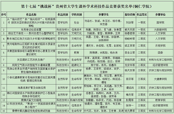近日,第十七届“挑战杯”贵州省大学生课外学术科技作品竞赛决赛在贵州师范大学圆满落幕。通过前期的校赛,beat365官网推送20个作品参加省赛,共有15个作品进入全省决赛,其中7个作品入围了决赛答辩。最终,beat365官网3个作品获得一等奖、5个作品获得省级二等奖、7个作品获得省级三等奖。