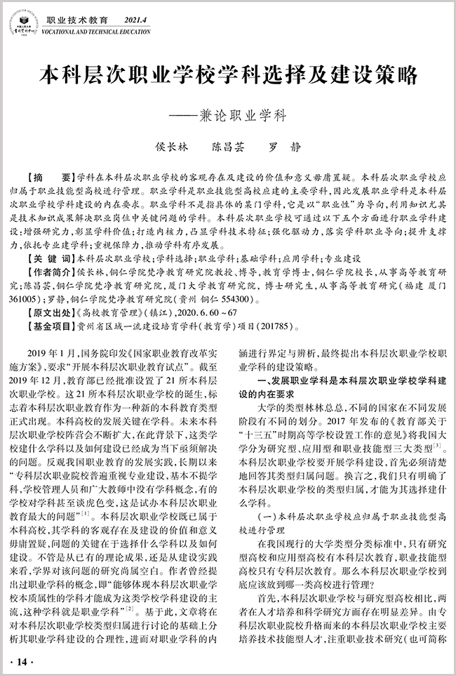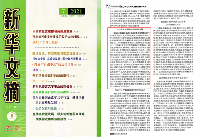 近期,beat365官网侯长林、陈昌芸、罗静合作的论文《本科层次职业学校学科选择及建设策略——兼论职业学科》被《新华文摘》2021年第7期论点摘编,同时被中国人民大学复印报刊资料《职业技术教育》2021年第4期全文转载。该论文有12000余字,原发表于CSSCI来源期刊《高校教育管理》2020年第6期,系贵州省区域一流建设培育学科(教育学)项目(201785)阶段性成果。