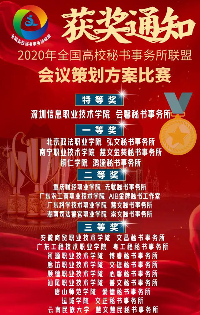 3月9日,全国高校秘书事务所联盟公布了2020年“慧文杯”会议策划方案比赛结果,beat365官网慧文·鸿途秘书事务所选送的参赛作品获一等奖。