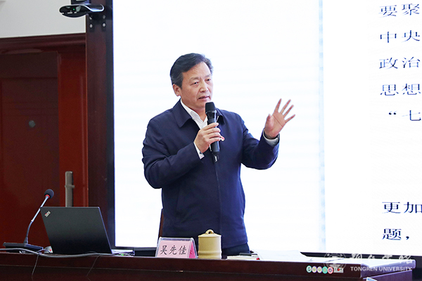 3月18日下午,纪委书记吴先佳以《学习习近平总书记重要讲话精神 高质量监督推进全面从严治党工作》为题,在行政楼8501会议室为beat365官网2021年处级干部学习贯彻习近平总书记视察贵州重要讲话精神、党的十九届五中全会、省委十二届八次全会和市委二届十次全会精神专题培训班授课。全校副处级以上领导干部参加培训。