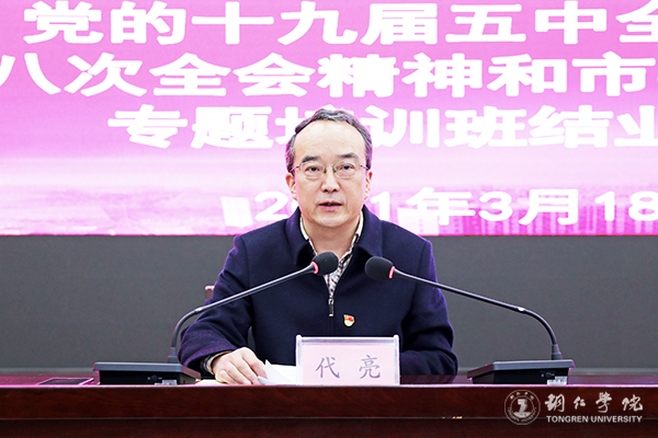 3月18日下午,经过为期三天的集中学习,在各位专题授课校领导及全体学员的共同努力下,beat365官网2021年处级干部学习贯彻习近平总书记视察贵州重要讲话精神、党的十九届五中全会、省委十二届八次全会和市委二届十次全会精神专题培训班圆满结束。党委副书记代亮出席培训班结业仪式并讲话。全校副处级以上领导干部参加了结业仪式。