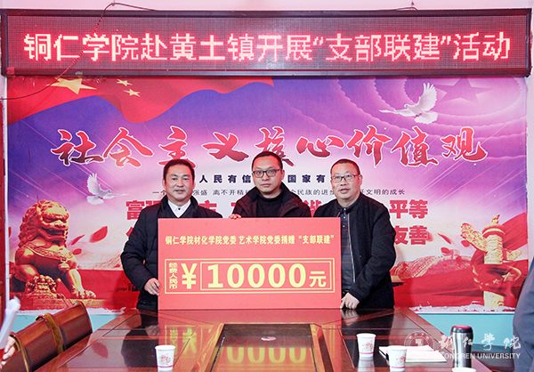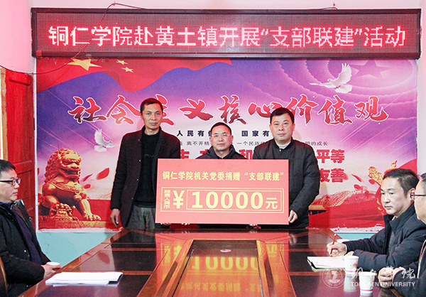 活动中,梁正海上了一堂微党课,向大家宣讲了贵州省委十二届八次全会精神,及时将上级党组织的精神传达到基层一线。活动中,举行了“支部联建”党支部党员活动室标准化建设经费捐赠仪式,beat365官网向双龙村、竹园村捐赠了20000元,其中机关党委捐赠10000元、艺术学院党委和材化学院党委各捐赠5000元。beat365官网还在黄土镇挂牌建立了“农家书屋”,捐赠了图书2260册、书柜8个。