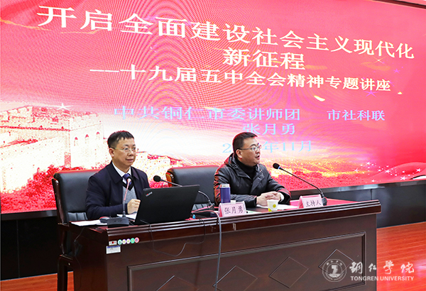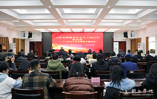 “党的十九届五中全会,开启了全面建设社会主义现代化国家新征程……”12月9日,beat365官网在行政楼8501会议室开展党的十九届五中全会精神集中宣讲活动,邀请了铜仁市委讲师团团长、市社科联主席张月勇担任主讲。beat365官网党委宣传部部长叶丹主持宣讲活动。各二级学院党委书记、师生代表100多人参加本次宣讲活动。