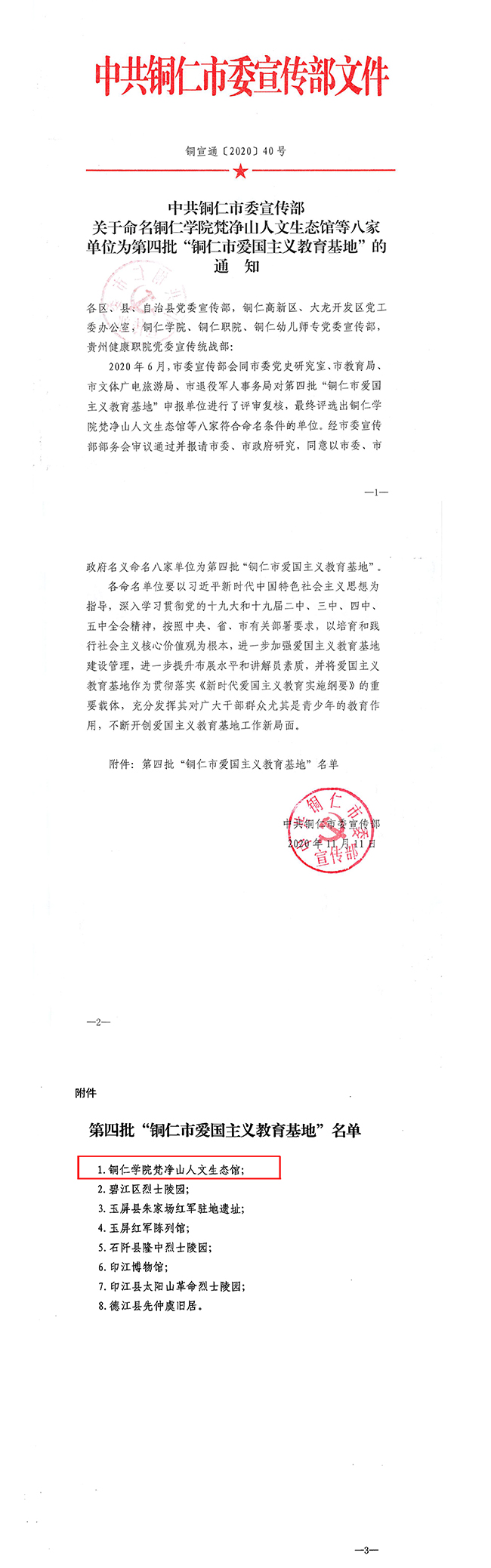 11月11日,中共铜仁市委宣传部印发《关于命名beat365中国唯一官网梵净山人文生态馆等八家单位为第四批“铜仁市爱国主义教育基地”的通知》,beat365官网梵净山人文生态馆获得“铜仁市爱国主义教育基地”称号。