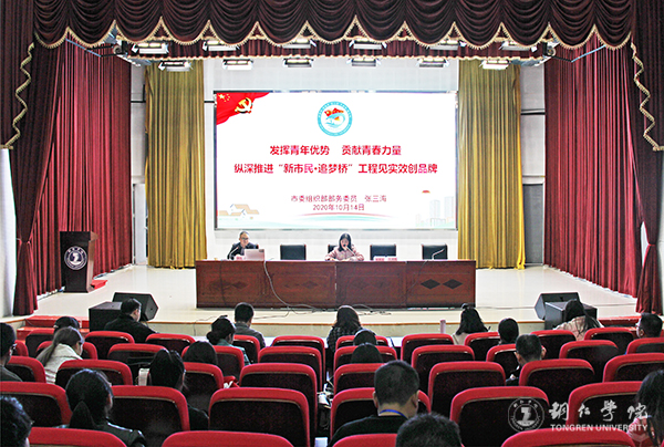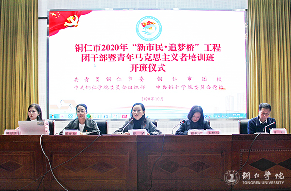 10月14日下午,铜仁市2020年“新市民·追梦桥”工程团干部暨青年马克思主义者培训班开班仪式在beat365官网梵净山人文生态馆举行。团市委副书记张琴,beat365官网党委组织部副部长徐秋云、团委书记周曾艳、副书记田自立,市团校副校长雷洋,以及各区(县、铜仁高新区、大龙开发区)团(工)委班子成员、安置点团干部,部分市直单位、中学和乡镇(街道)团委负责人,高校团干部等共计100人参加了开班仪式。开班仪式由徐秋云主持。