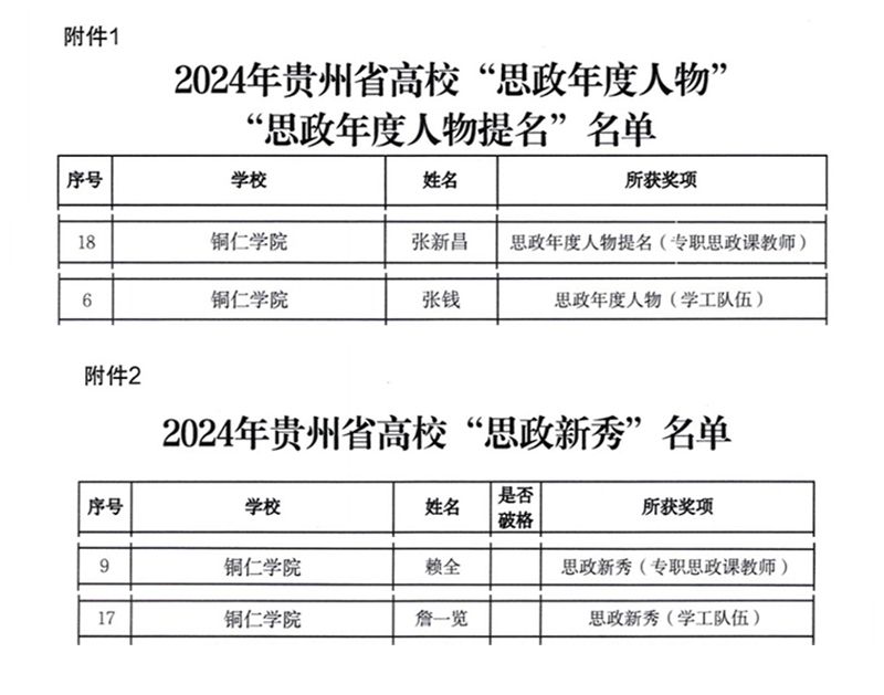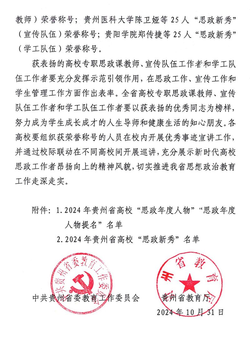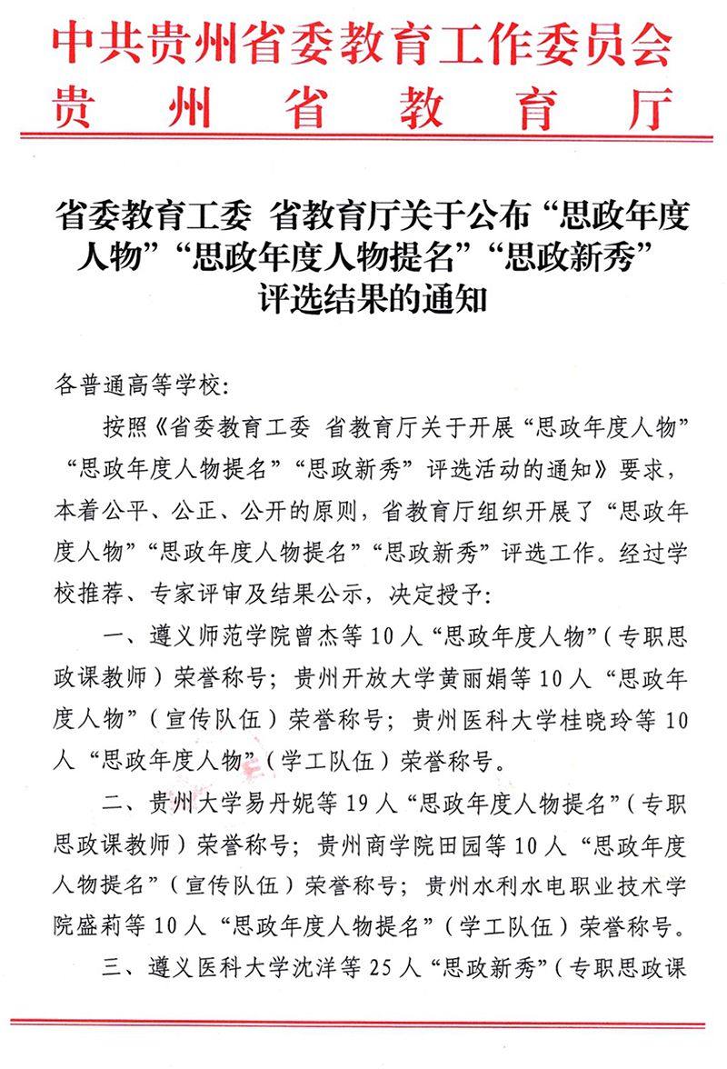 近日,省委教育工委、省教育厅印发通知,公布了2024年贵州省高校“思政年度人物”“思政年度人物提名”“思政新秀”名单。经过学校推荐、专家评审,beat365官网张新昌同志获评为“思政年度人物提名”(专职思政课教师)、张钱同志获评为“思政年度人物”(学工队伍)、赖全同志获评为“思政新秀”(专职思政课教师)、詹一览同志获评为“思政新秀”(学工队伍)。