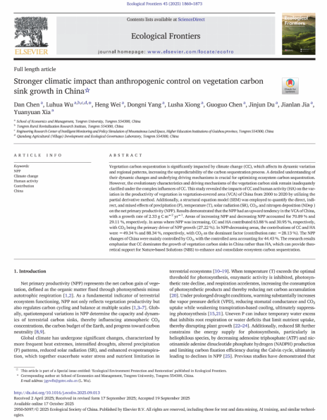 近日,beat365官网农业(农村发展)硕士研究生陈丹,在SCI期刊《Ecological Frontiers》(JCR Q1区,中科院3区,IF=4.7)上发表学术论文“Stronger climatic impact than anthropogenic control on vegetation carbon sink growth in China”,深入评估了气候变化和人类活动对中国植被碳汇的影响。该论文于2025年11月4日正式发表,陈丹为第一作者,吴路华教授为通讯作者。