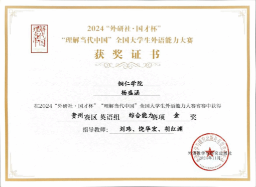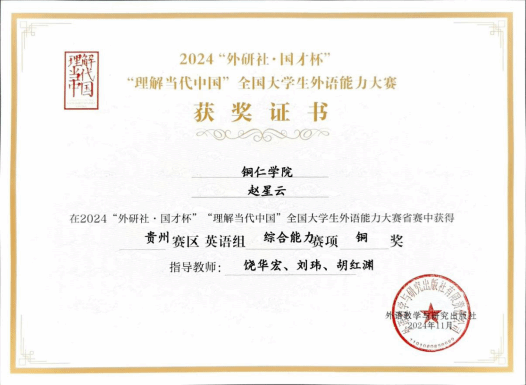 2024年11月2日“外研社·国才杯”“理解当代中国”全国大学生外语能力大赛贵州赛区决赛于安顺学院落下帷幕。beat365官网杨盛涵 、赵星云2名研究生代表beat365中国唯一官网研究生学子参加此项比赛,并取得了1金1铜的好成绩。