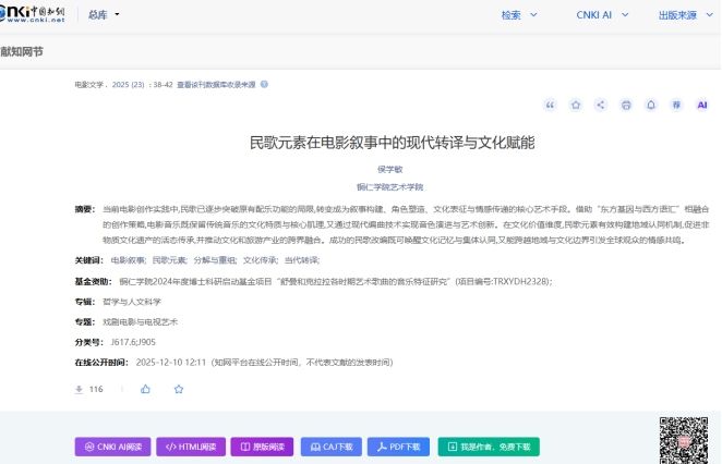 近日,我院音乐与表演系青年教师侯学敏博士的最新研究成果《民歌元素在电影叙事中的现代转译与文化赋能》,在国内著名核心期刊《电影文学》2025年第23期正式刊出。