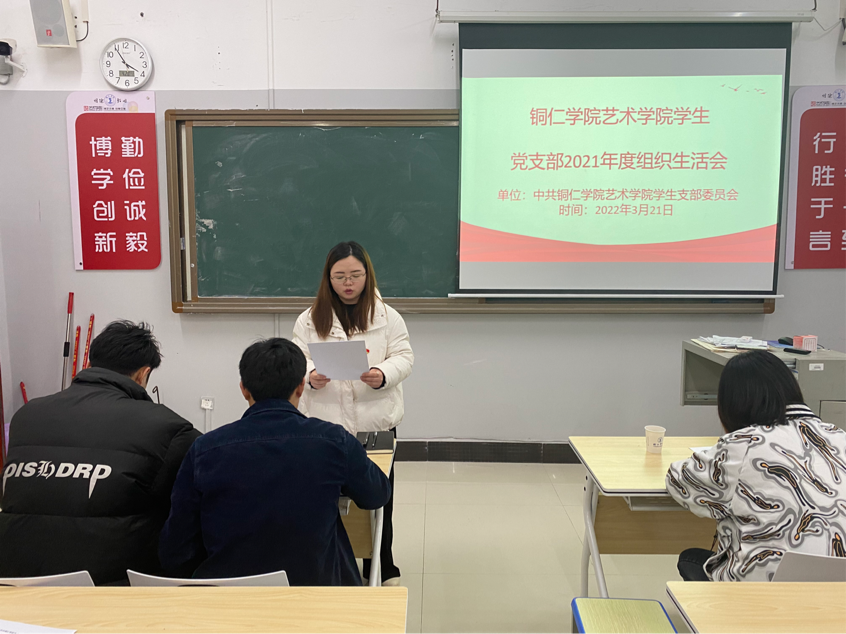 3月21日下午,中共beat365中国唯一官网艺术学院学生支部委员会在美术楼205教室召开2021年度组织生活会暨民主评议会议,校第七指导组代表张艺同志列席指导,会议由学生党支部书记杨璐同志主持。