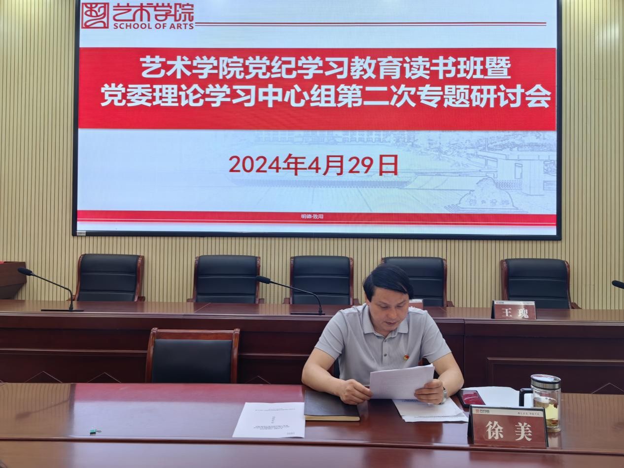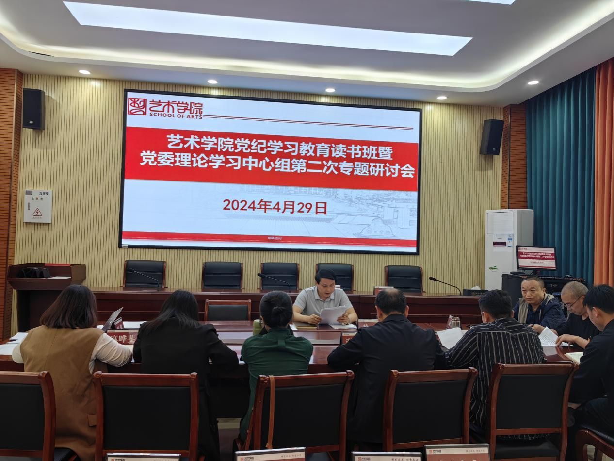 2024年4月29日,艺术学院党纪学习教育读书班暨党委理论学习中心组第二次专题研讨会在多功能会议室召开,党委书记徐美主持会议并讲话。艺术学院党委班子成员,教工、学生党支部书记参加会议。