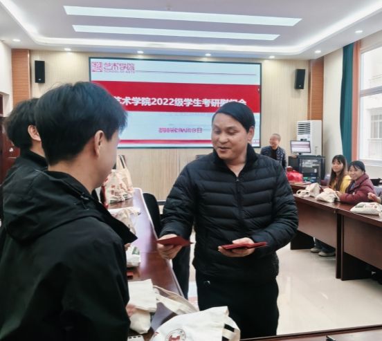 为助力2022级考研学子从容备考、温暖迎考,12月18日,我院在会议室开展考研慰问活动,为即将奔赴考场的学子送上暖心物资与真挚祝福。党委书记徐美、院长张敬忠、党委副书记麻晔斐、副院长龙庆华出席活动,与考研学子面对面交流鼓劲。 活动现场,学院领导与老师们亲手将考研加油礼包、红包等慰问物资送到学子手中,每一份物品都饱含着学院对考研学子的关怀与期许。院领导分别对学生进行勉励,考研是一场持久战,学院始终是学子们最坚实的后盾,希望大家调整心态、沉着应战,把学院的关怀转化为备考的动力,以自信的姿态迎接考试,不负多年的努力与付出。备考后期要兼顾学习与身心健康,注意防寒保暖和饮食作息,遇到压力和困难及时与老师、同学沟通,学院会全力为大家解决备考中的各类问题。为考研学生加油打气,祝福同学们成功上岸,让活动现场更加温暖人心。 此次考研慰问活动,不仅为学子们送去了考研的温暖,更传递了学院对人才培养的重视与对学生成长的牵挂,让艺术学院的考研学子在寒冬备考路上倍感温情与鼓舞。