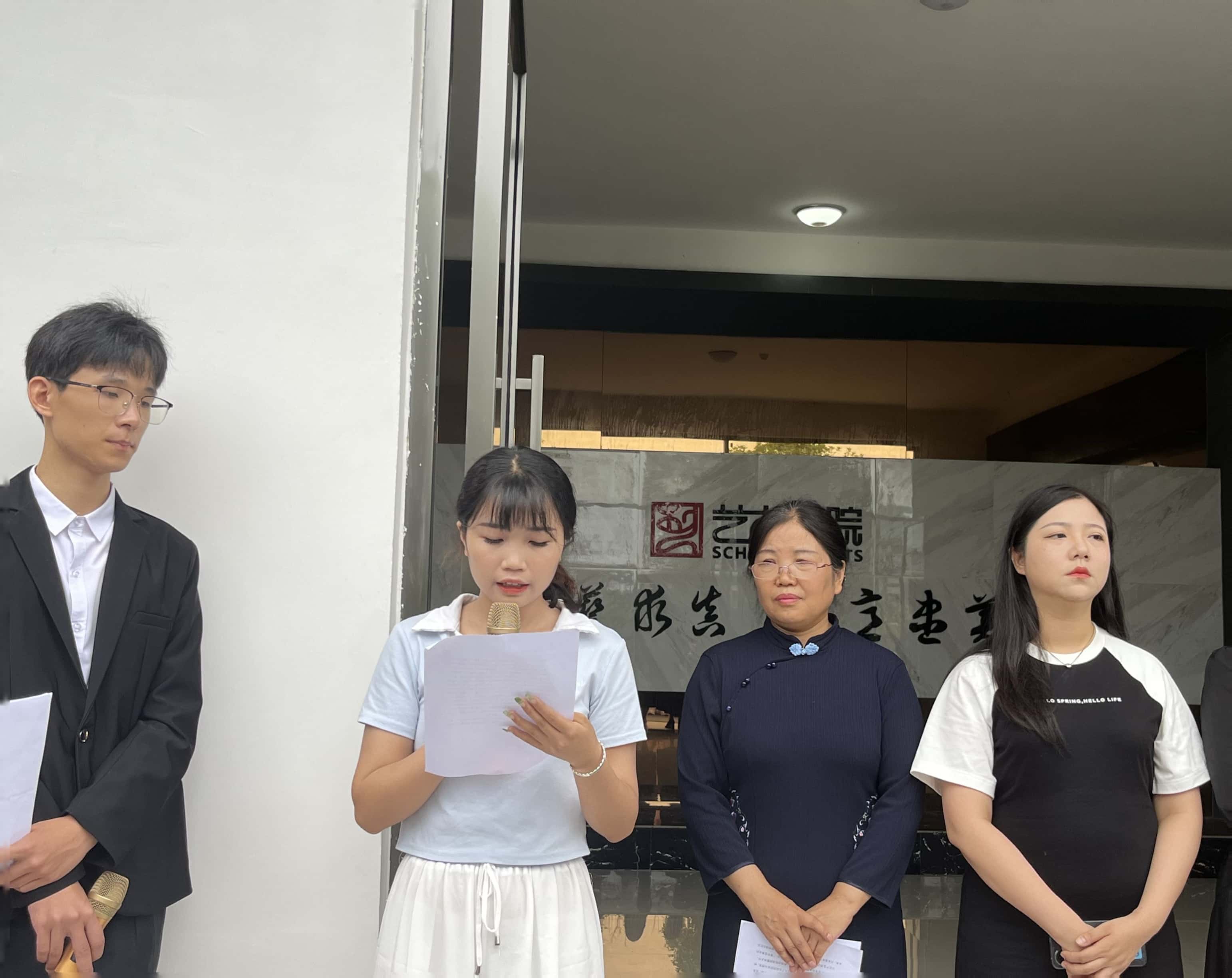 毕业生代表、美术学班刘娅同学代表毕业生在发言中表达了对母校的不舍和对老师们的感谢。她说,本次作品展是对大学四年学习成果的集中展现,是对艺术水平的一次检阅,更是为展现同学们的青春风采和精神风貌提供了广阔的舞台。未来的道路可能会充满挑战,可能会有困难,可能会有失败,但我们并不害怕,因为我们已经做好准备。“恰同学少年,风华正茂,书生意气,挥斥方遒”我们正值青春,应奋力挥桨驶向梦想彼岸。