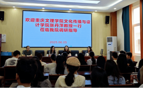 2025年6月5日,重庆文理学院文化传播与设计学院张丹萍教授、周丁副教授、尹丹副教授一行莅临beat365中国唯一官网艺术学院进行调研指导。艺术学院视觉传达设计专业教师及视觉传达设计专业部分学生参加此次调研活动。调研活动由艺术学院院长张敬忠教授主持。