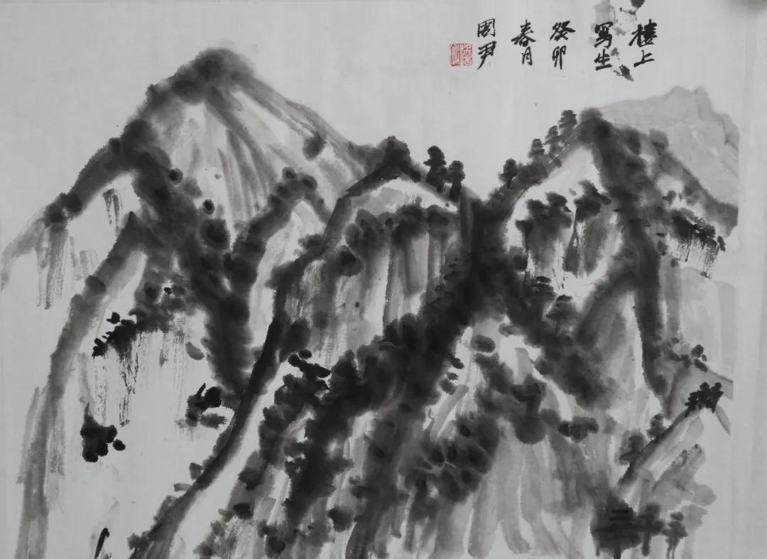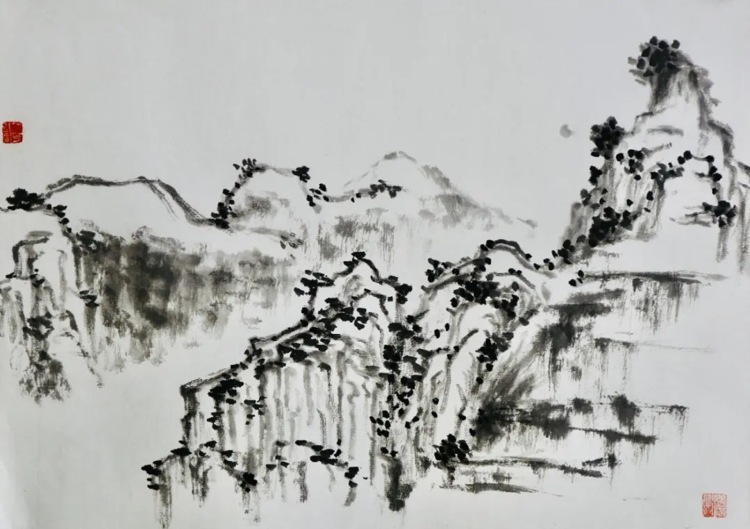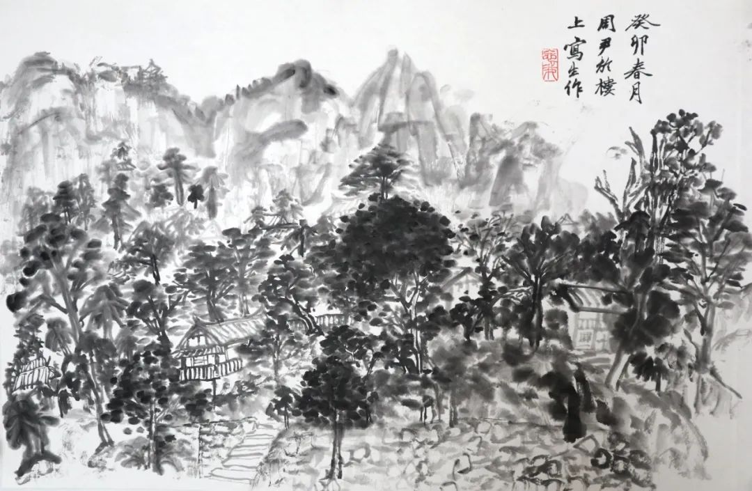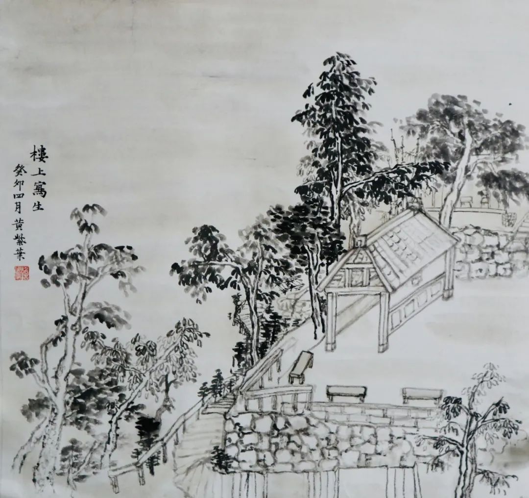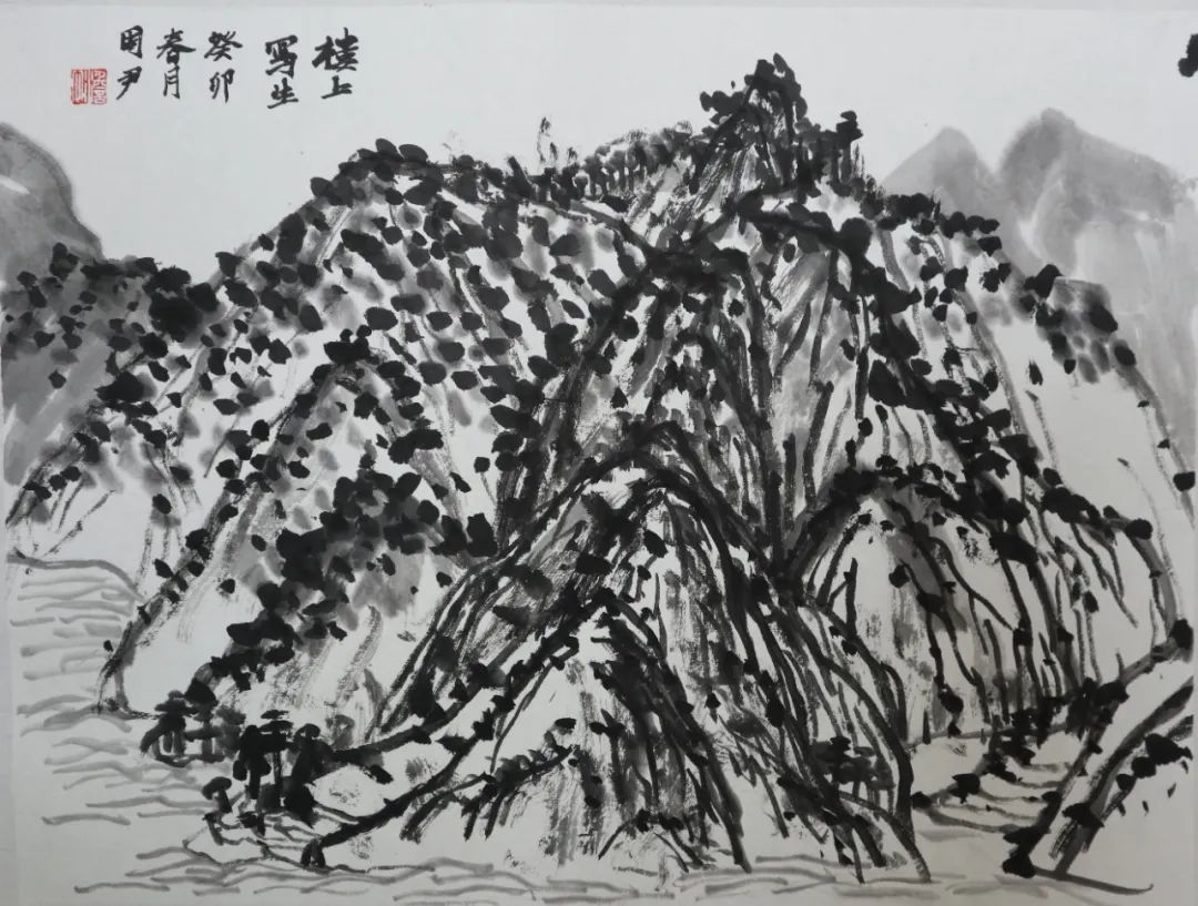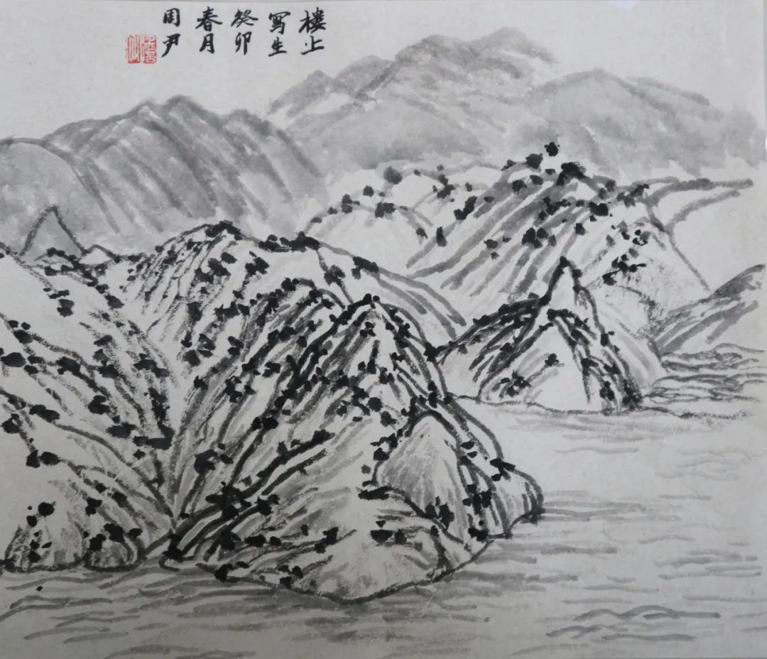 何为山水写生?在这次楼上之行前,我一直认为它与以往的绘画写生并无不同,只是把工具换成了毛笔。直到老师指出,“不要把山水画写成风景画,它不同于西画的透视观看方式”。我才开始渐渐明白原来山水画不是普通的删减后留出大片空白,也不是看见什么就画什么。这种删减也是根据画面需求而来的,适当的留白一方面是为了让画面不被堵死,尤其是画面的边边角角;再者是让画有更多迁想的空间。