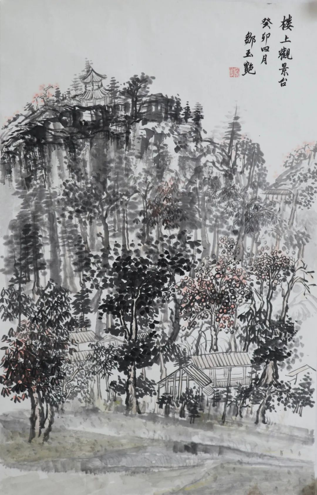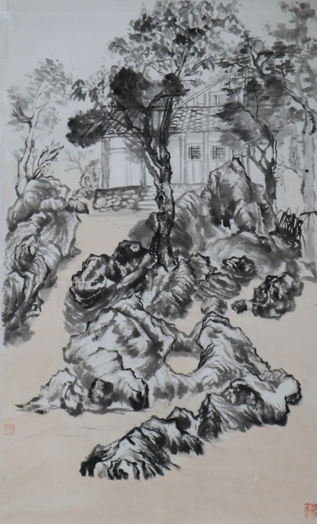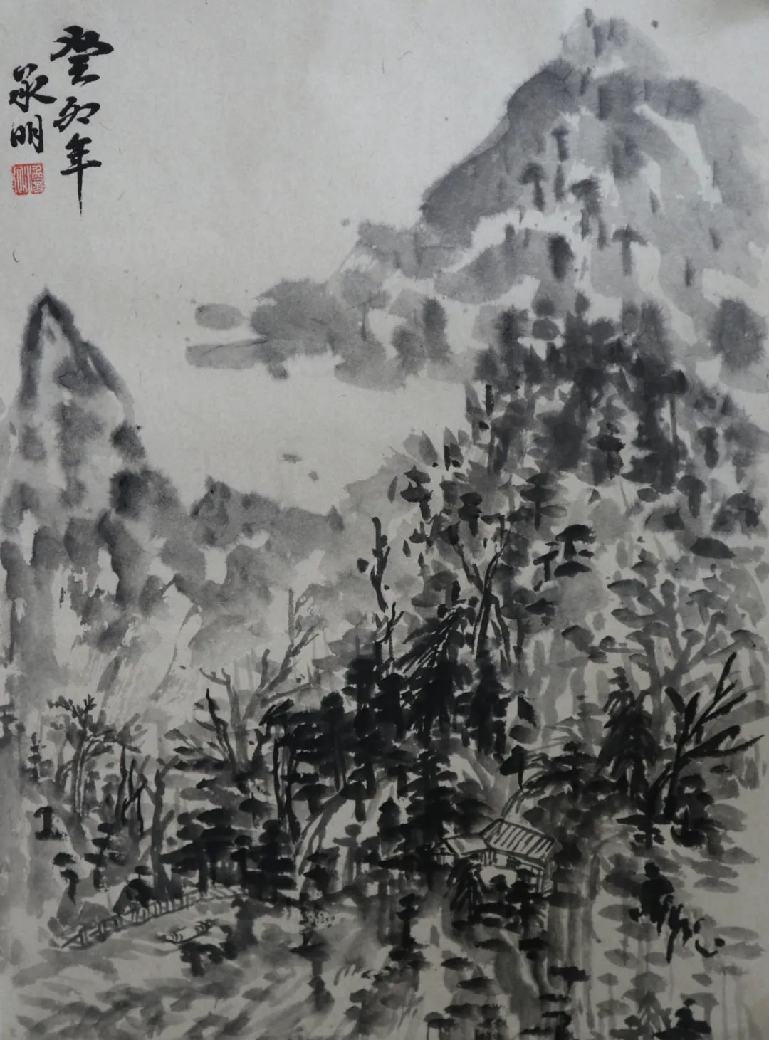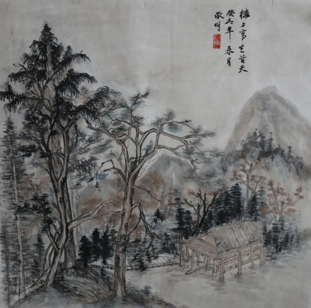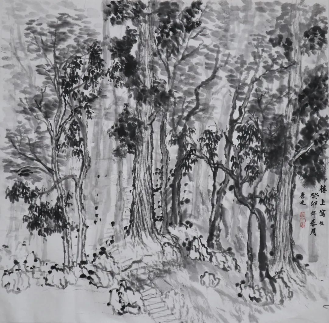何为山水写生?在这次楼上之行前,我一直认为它与以往的绘画写生并无不同,只是把工具换成了毛笔。直到老师指出,“不要把山水画写成风景画,它不同于西画的透视观看方式”。我才开始渐渐明白原来山水画不是普通的删减后留出大片空白,也不是看见什么就画什么。这种删减也是根据画面需求而来的,适当的留白一方面是为了让画面不被堵死,尤其是画面的边边角角;再者是让画有更多迁想的空间。