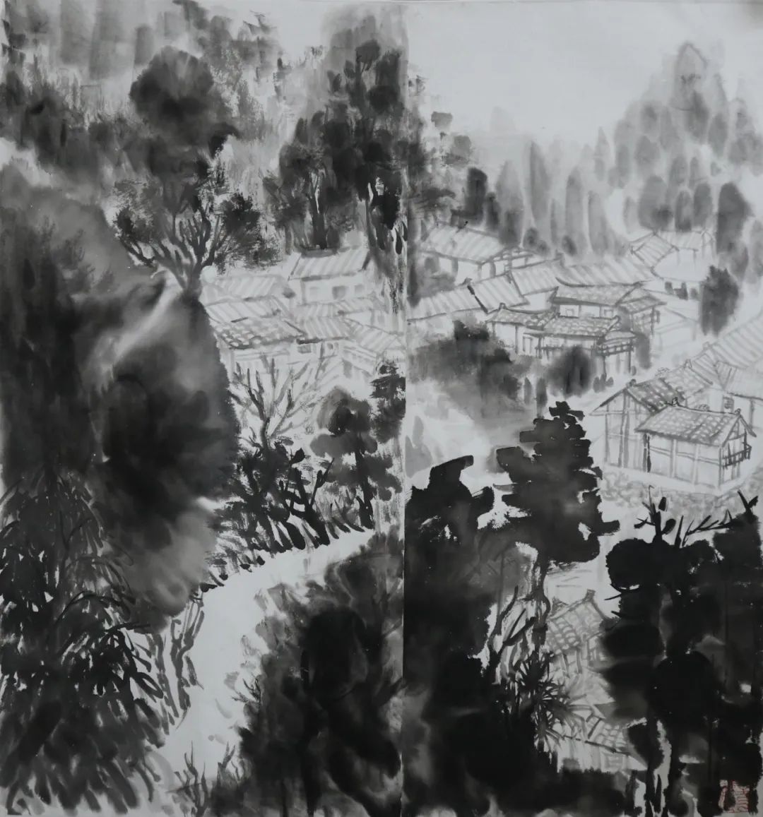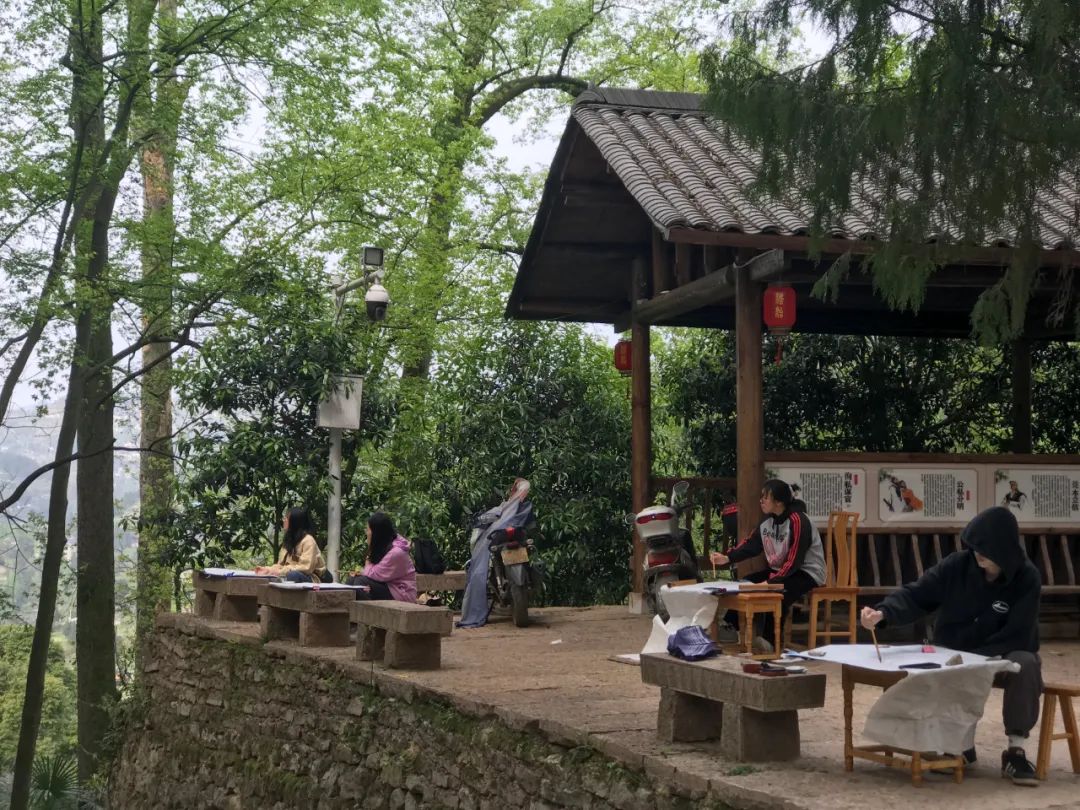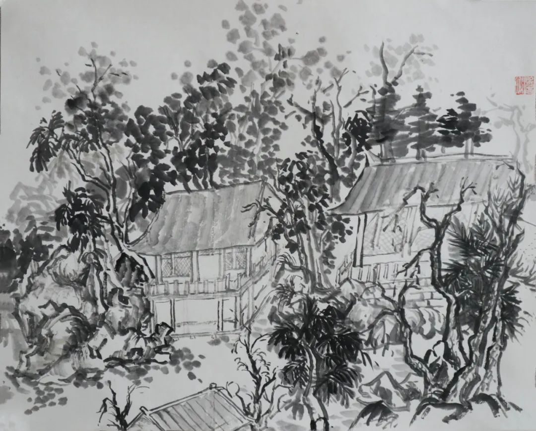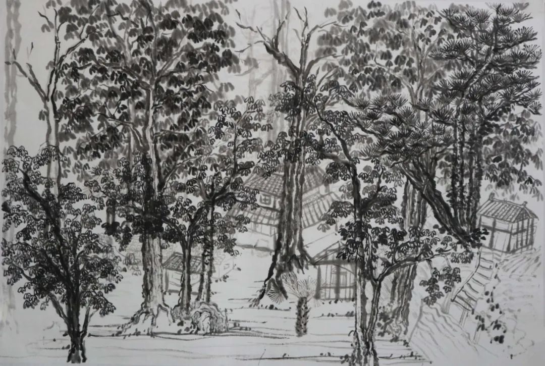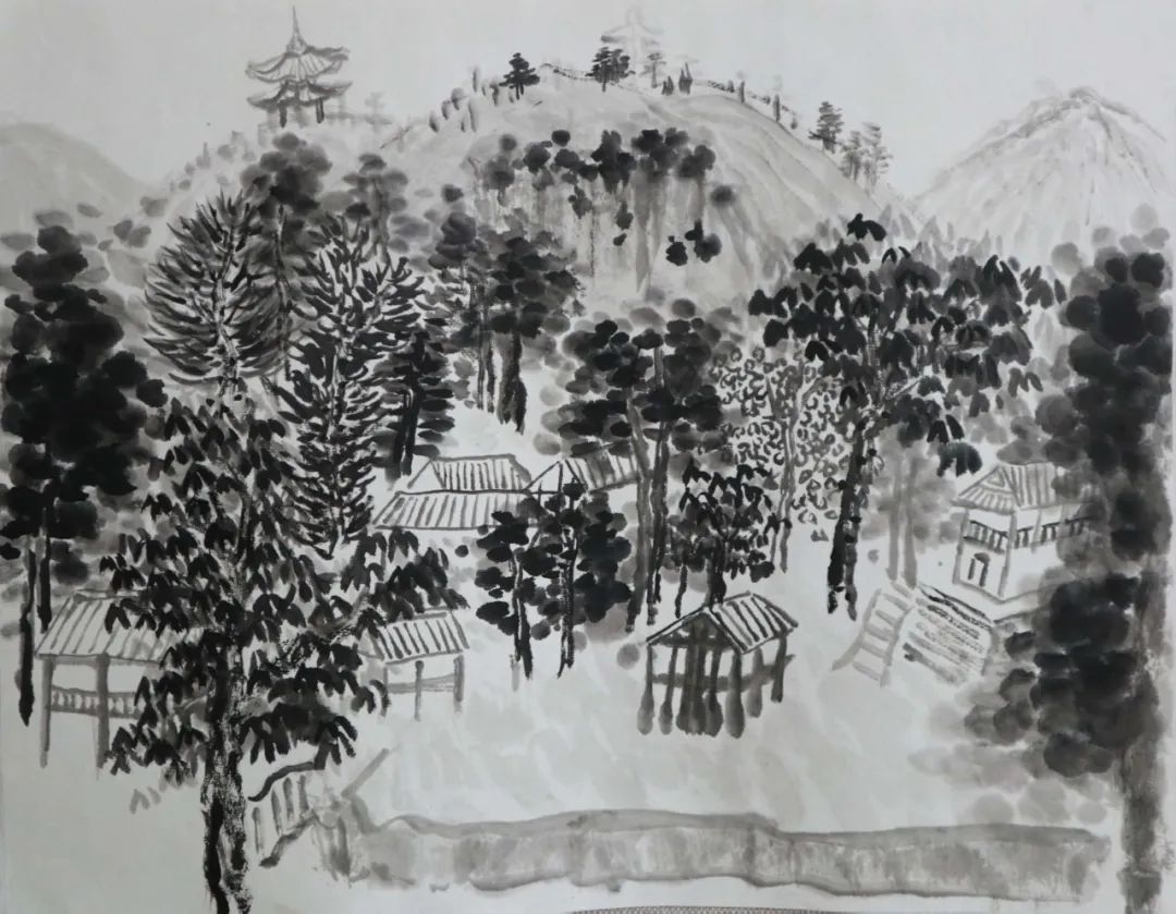 写生之旅很快到来,大家兴致勃勃,期待着这次外出。或许是太久未画,亦是基础掌握不牢,才导致来到现场不敢下笔。全然忘记需要注意的问题,整体的构图,树木、山体的位置,墨色的浓淡干湿,整体的气韵生动。总害怕画错,内心没有底气。而底气的来源于平时的临摹积累,都远远不够。就算之前掌握的一些笔墨技法,也没有灵活运用,脑子没有转起来。与此同时,心情也是十分低落,没有信心。但是,在这短短的七天内,不仅看见了山林和树木,感受到了大自然的美好,而且还学到很多东西,能够区分山水画和风景画;对房屋结构有了一些了解;选取不同的景物的运用;避免画面的散乱;从一种游走和俯瞰的视角来观看。让我不由得感叹写生很难,考虑的因素很多。