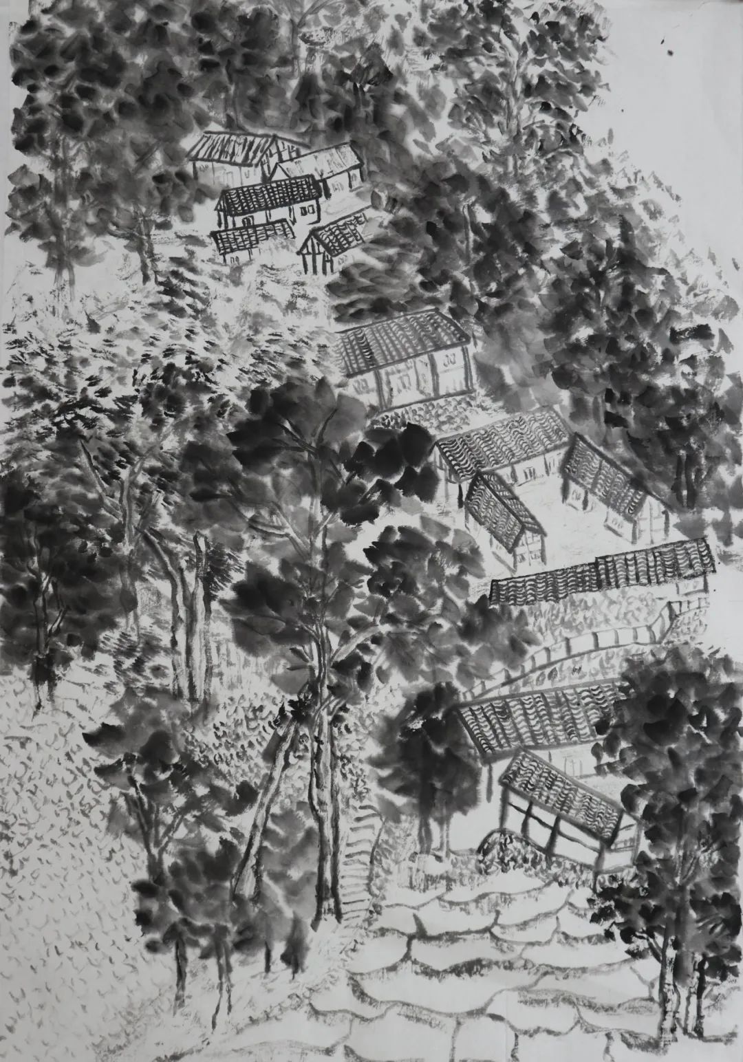 在选景方面,刚刚开始画的时候,我并不知道自己到底最想表达什么东西,就是看见什么就画什么,没有“六法”里的“经营位置”,只是把画面中的空白尽量的画丰富画满,比如画一片远景村庄,我想重点表现房子,然后把其他房子再高低错落摆放进去,但是每一次都会把重点表现的地方画大或者画得太实,本来画的是远景,但是画大了之后就成了近景,为了画面效果就只能把树也放大了画。房子的疏密安排也是做的非常的不好,画出来总是感觉奇怪,这种奇怪我说不上来。所以,以后在选好景后,我一定要起一个小稿子,把画面的构图经营好后再下笔,然后再酌情选择物象,多作构图练习。还有时候画着画着,画面就没有疏散的地方了,会把所有的地方画得太满,后来慢慢的觉得山水画写生的时候一定要画简单化,注意虚实结合,注重当时自己写生的感受,大胆的画,细心的处理细节,不必画的太多太过繁琐。