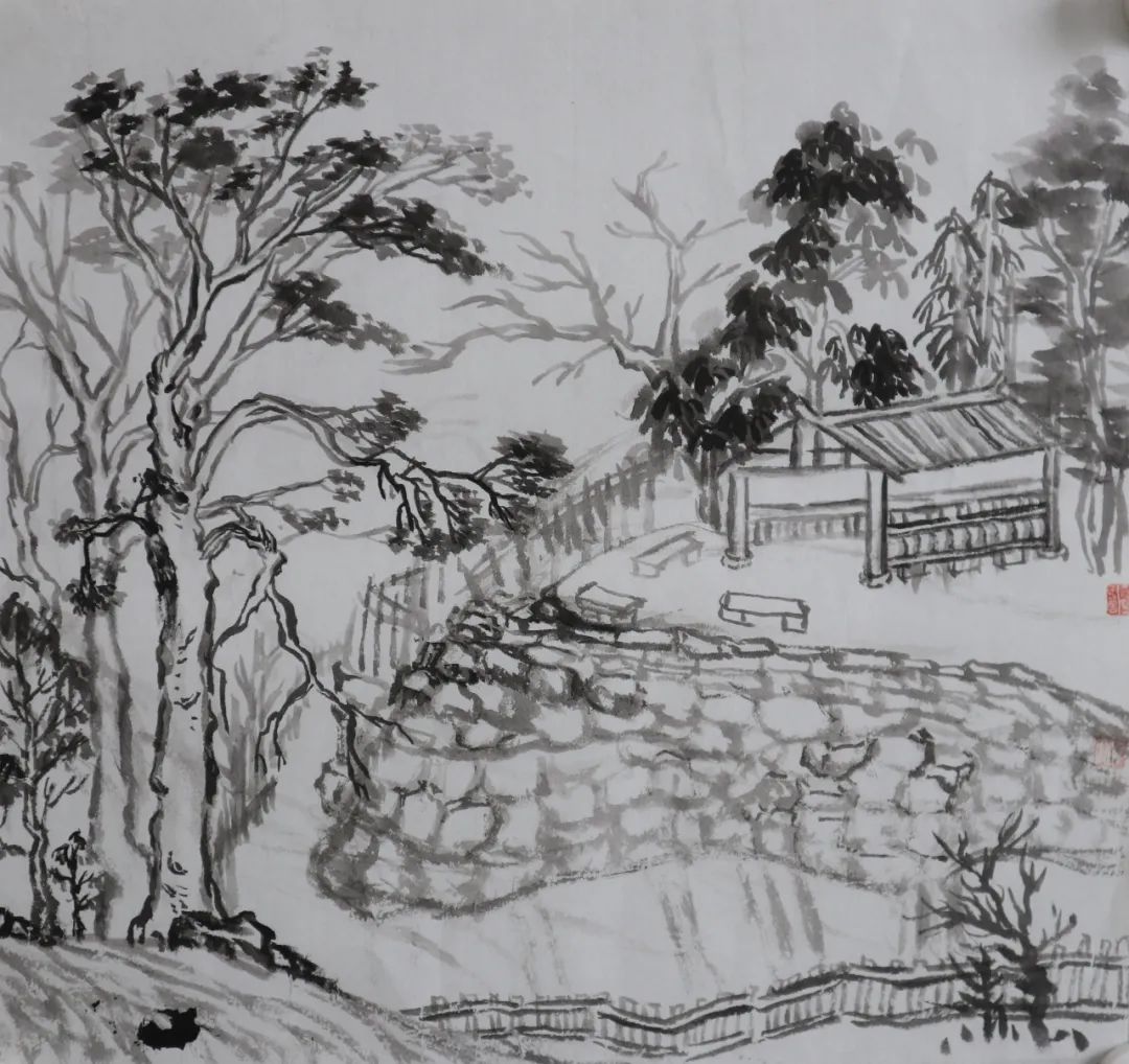 这一次写生让人感触很多,从看景到动笔这个过程让我对国画有了真正意义上的一些了解。第一天写生我因为生涩,基础薄弱,久久不能下笔。随着时间推移,我似乎感受到了其中的一些乐趣,变得敢于动笔,敢于去想象。但在这里面,我每一次都能发现很多问题,而这些问题是我不能释怀的,兴许是脑袋里的空白让我不知如何去调整。我也回望过去自己临摹的时候,却始终差很多东西。看着清静的村庄,感受着淳朴的民风,我有种身在桃源的感觉,但这种感觉我却无法表现。我试着感受大自然的气息,但这种气息似乎没有和自己融在一起,加上笔墨表现力不足、天气的炎热、心里的沉闷,我开始怀疑自己,心理也产生了各种不安。画画的时间里,老师们一直在引导着我们,但我却没有平静下来认真的反思自我,等离开时,有些东西才恍然大悟。这一次的经历让我变得有些通透。总的来说,我这几天的问题是比较多的,其大概包含以下几点: