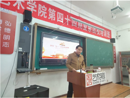 为使我院团员能明白如何做一名优秀的共青团员和如何践行大学生的初心使命,11月4日艺术学院于美术楼201教室开展业余团校第四十四期培训活动。本日培训由艺术学院党委书记徐美、党委副书记麻晔斐进行专题讲座,70名学员参加培训。
