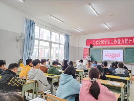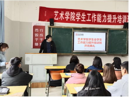 为了提高我院学生干部的工作能力,让我院学生干部注意外在形象、规范日常礼仪,树立良好的学生干部形象。艺术学院于4月6日中午,在美术楼206教室举行了艺术学院学生会学生工作能力提升培训班开班典礼,艺术学院党委副书记麻晔斐老师、学生发展科科长龙黎老师、教务科科长张少涛老师、团总支书记徐秋逸老师、党务科杨璐老师出席本次开班典礼,团总支学生会全体成员参加。本次典礼由龙正凤主持。