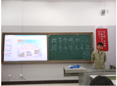 此次班会中,主持人首先向学生们介绍了改革开放40周年以来我国在经济、政治、民生、外交等领域进行了深层次的、根本性的变革,取得了全方位的、开创性的成就。让学生们解了改革开放以来,我国发生了翻天覆地的深刻变化。接着,主持人主要从以下八个方面来展开了详细的解释:一、我国经济发展水平不断提高,二、治国理政取得重大成效,三、社会民生不断改善,四、社会事业繁荣发展,五、基础设施建设卓有成效,六、科技创新成果大量涌现,七、生态文明建设取得积极进展,八、外交事业进一步发展。让学生们明白了只有更好的学习党的先进理论知识并结合自身实践,用自己所知所学帮助同学,回报社会,为中国梦的实现付出自己应尽的义务和责任。随后,各班辅导员就以上的八个问题向同学们发起提问并检测其学习的效果,同学们也都积极的回答了相应题目的问题。18美术学唐云云分享了自己的感言:“作为新时代的青少年学生要学会珍惜时间,刻苦学习,肩负起光荣的历史革命,提高素质,努力成才。”