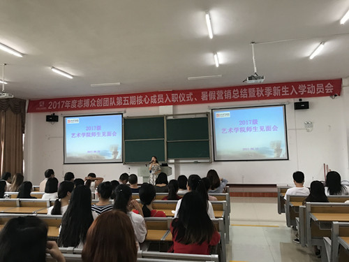 2017年9月10日上午,艺术学院在博思楼102召开2017级新生见面会。艺术学院2017级音乐学、美术学、视觉传达设计全体新生人与艺术学院行政管理人员参加此次活动。