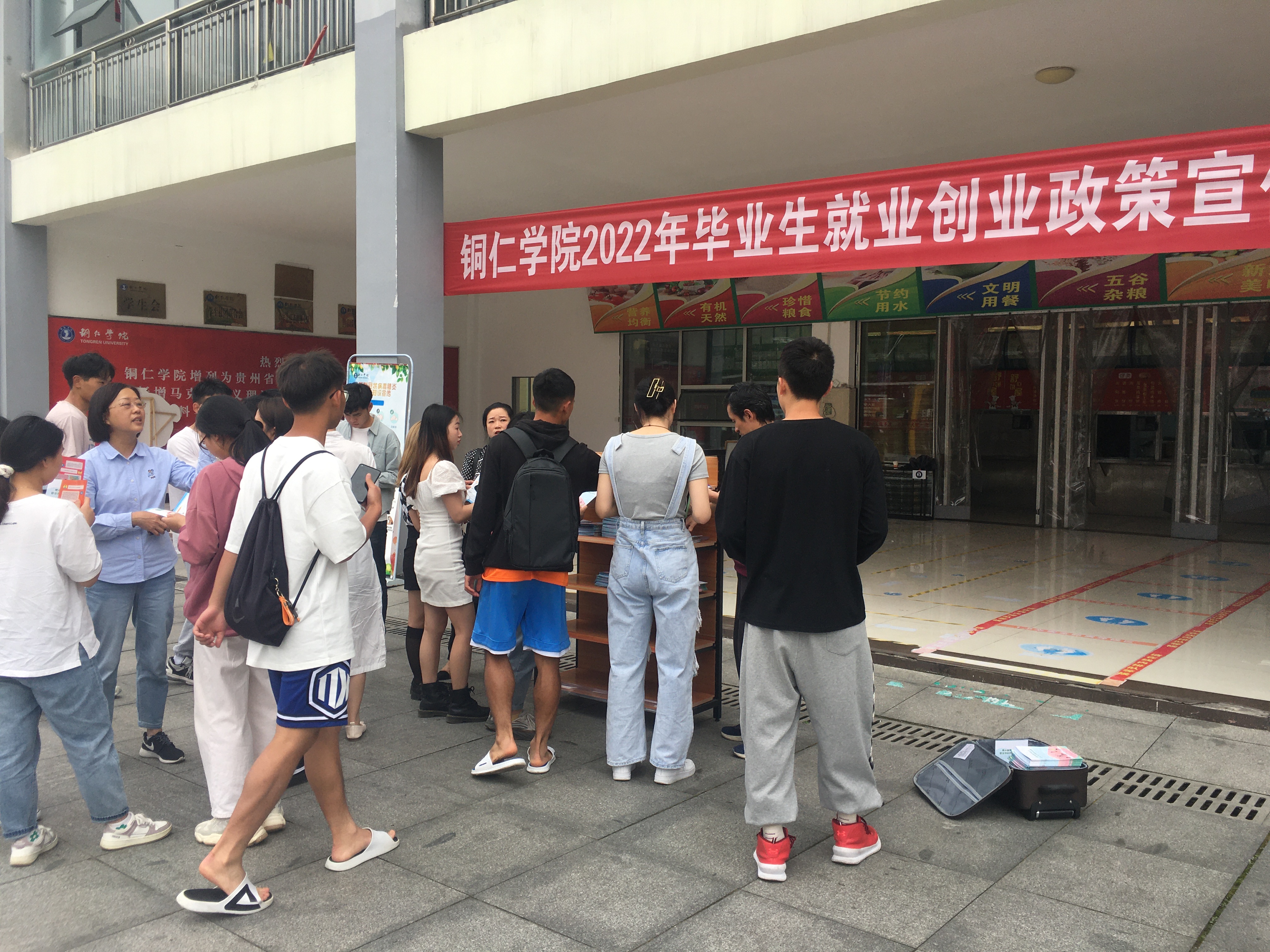 为落实教育部《关于开展2022年高校毕业生就业创业政策宣传月活动的通知》文件精神,深入开展促进就业创业服务工作,在学生中全面宣传就业创业政策,铜仁学院招就处于5月7日下午在丹桂餐厅公共区域开展就业创业政策宣传、咨询活动。分管领导罗静副校长莅临现场与学生交流,宣传政策。招生就业处处长杨艳、副处长赵坤,招生就业处全体工作人员参与了现场政策宣讲、答疑活动。