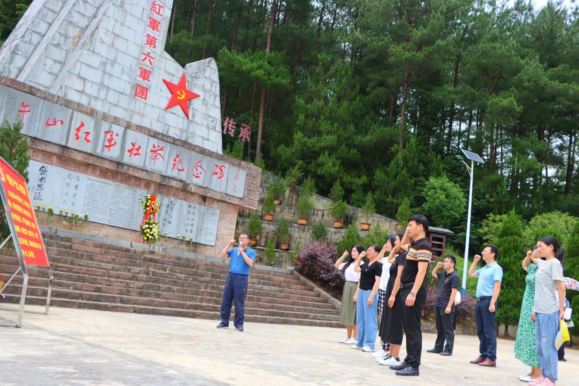 在困牛山红军壮举纪念碑前,皮坤乾为革命先烈敬献花篮。全体党员庄严肃立、凝心聚神,认真聆听困牛山村党支部副书记张国玉介绍那段可歌可泣的英雄史,深切缅怀革命先烈坚定信念、勇于牺牲、赤诚为民、敢于牺牲的崇高精神。随后,全体党员面向纪念碑鞠躬,面对党旗重温入党誓词,实地参观了困牛山新时代文明实践中心、红色美丽村庄指挥部和当年红军战士集体跳崖的地方,进一步加深了大家对困牛山战斗这段党史故事的认识和了解。