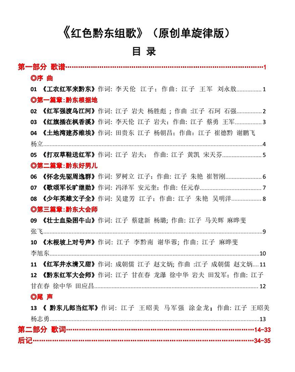 崔德虎教授团队秉持“苦心励志·追求卓越”的大学精神,践行“厚重·灵性·担当”的大山品格,历时4个多月,跋山涉水,进入乡村,深入居民家中,重走黔东红色之路,一路寻访高龄老人,通过各种方式查询历史资料、亲身考察战斗遗址等,为《红色黔东组歌》创作提供丰富详实的原始素材,为创作打下坚实基础。《红色黔东组歌》分为5个部分,即“序曲(1个作品);第一篇章(黔东根据地、4个作品);第二篇章(黔东好男儿、3个作品);第三篇章(黔东大会师、4个作品);尾声(1个作品)”,共13个音乐作品。